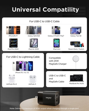 45W USB C Charger, 2-Port PPS Compact Foldable GaN Charger for iPhone 17/16, iPad, Galaxy S25 S24, Pixel 10/9, Compatible with MagSafe