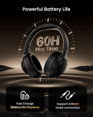 - [60H Long Playtime] With ultra-long 60-hour battery life, wegear HS1 noise cancelling headphones keep you powered through long trips and enjoy up to about 900 songs. A 10-minute quick charge provides 5 hours of playtime. Memory foam earcups and headband ensure comfort, while the adjustable design fits all head sizes.