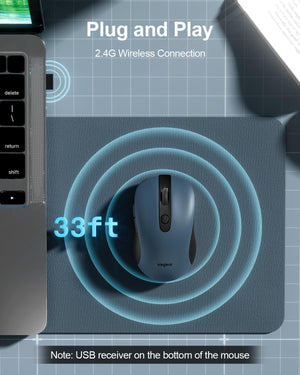 - 【Plug and Play】No drivers required. 2.4GHz wireless technology delivers a stable, powerful connection up to 33ft (10m), minimizing interference and delay. (Note: USB receiver is stored at the bottom of the mouse)