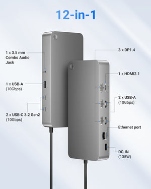 - 12 in 1 Expansion: Plug and play. Say Goodbye to Clutter.Equipped with 1*HDMI2.1、3*DP1.4;USB Ports: USB-A:3*1Gbps、1*10Gbps、USB-C:2*USB3.2 Gen2 10Gbps;Networking: an Ethernet port;Audio: 1 x 3.5 mm Combo Audio Jack
