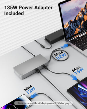 - PD135W Adapter: DS1 docking station comes with a 135W adapter for laptop charging, no longer need a laptop power adapter. It will power your laptop with up to 92W charging power, and charge your other devices through the USB-A port at up to 12W and the USB-C port at up to 15W charging power