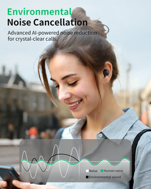- [Environmental Noise Cancellation Earbuds] Make crystal-clear calls with Bluetooth earbuds featuring 4 microphones and advanced AI-powered environmental noise cancellation. The AI algorithm reduces background noise, keeping your voice distinct and clear, even in noisy surroundings.