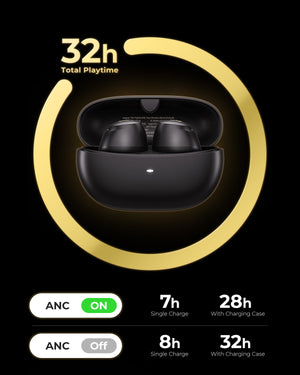 - [32 Hours Long Playtime] Get up to 8 hours of listening time on a single charge, enough to enjoy around 480 songs. With the convenient charging case, achieve a total of 32 hours—ideal for work, exercise, or travel without battery worries. The IPX5 water resistance protects against sweat and light rain, ensuring durability for any scenario. Note: With ANC mode on, total playtime is reduced to 24 hours.